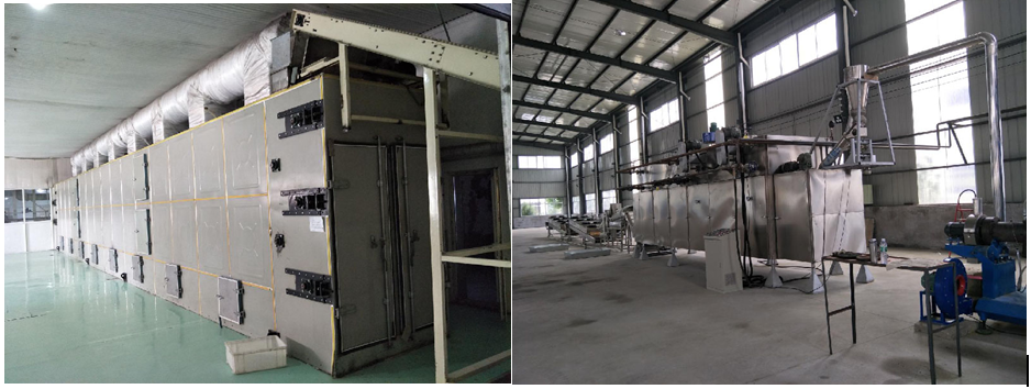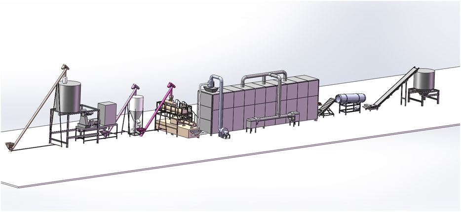 設備配置一:拌粉機-螺旋輸送機-調制器-雙螺桿膨化機-風送機-烘干機-雙滾筒調味機-冷卻機
