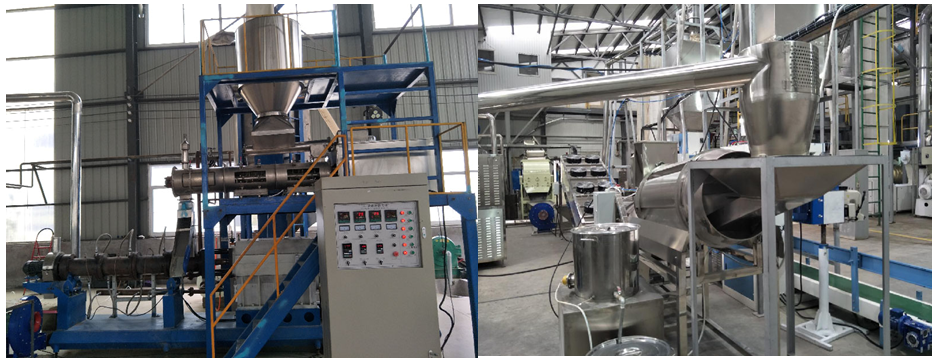 濕法生產工藝:原料粉碎-混合-調制-擠壓膨化-烘干-噴油調味-冷卻-包裝