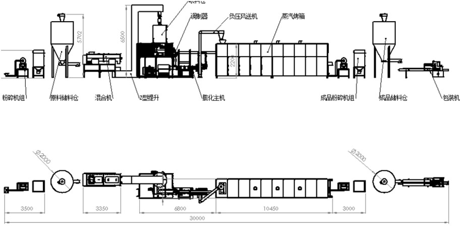 該生產投資小,產量高,占地面積小,自動化運行程度高等特點。整機使用不銹鋼材料加工。保證衛生整潔。膨化技術使用國際先進的雙螺桿擠出技術。